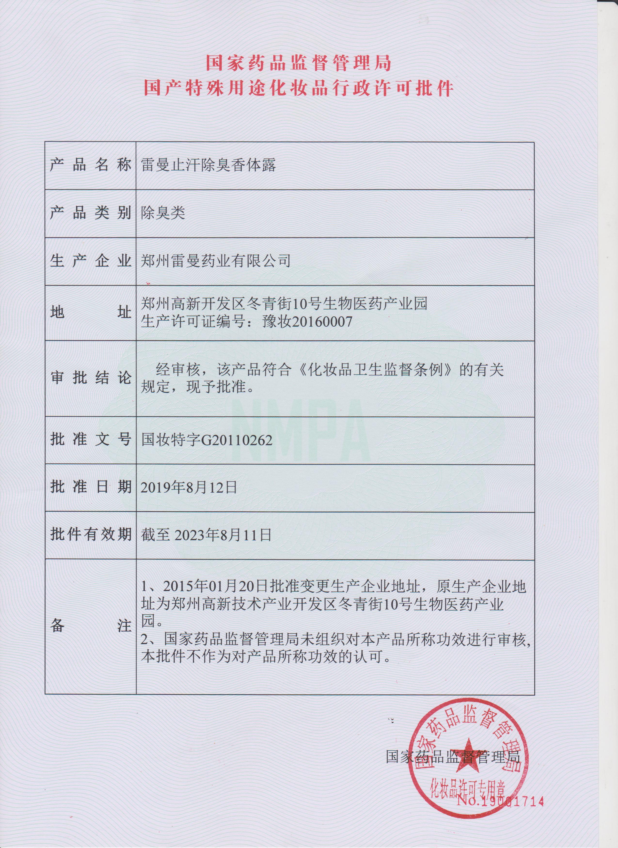 止汗除臭特殊用途化妝品批件