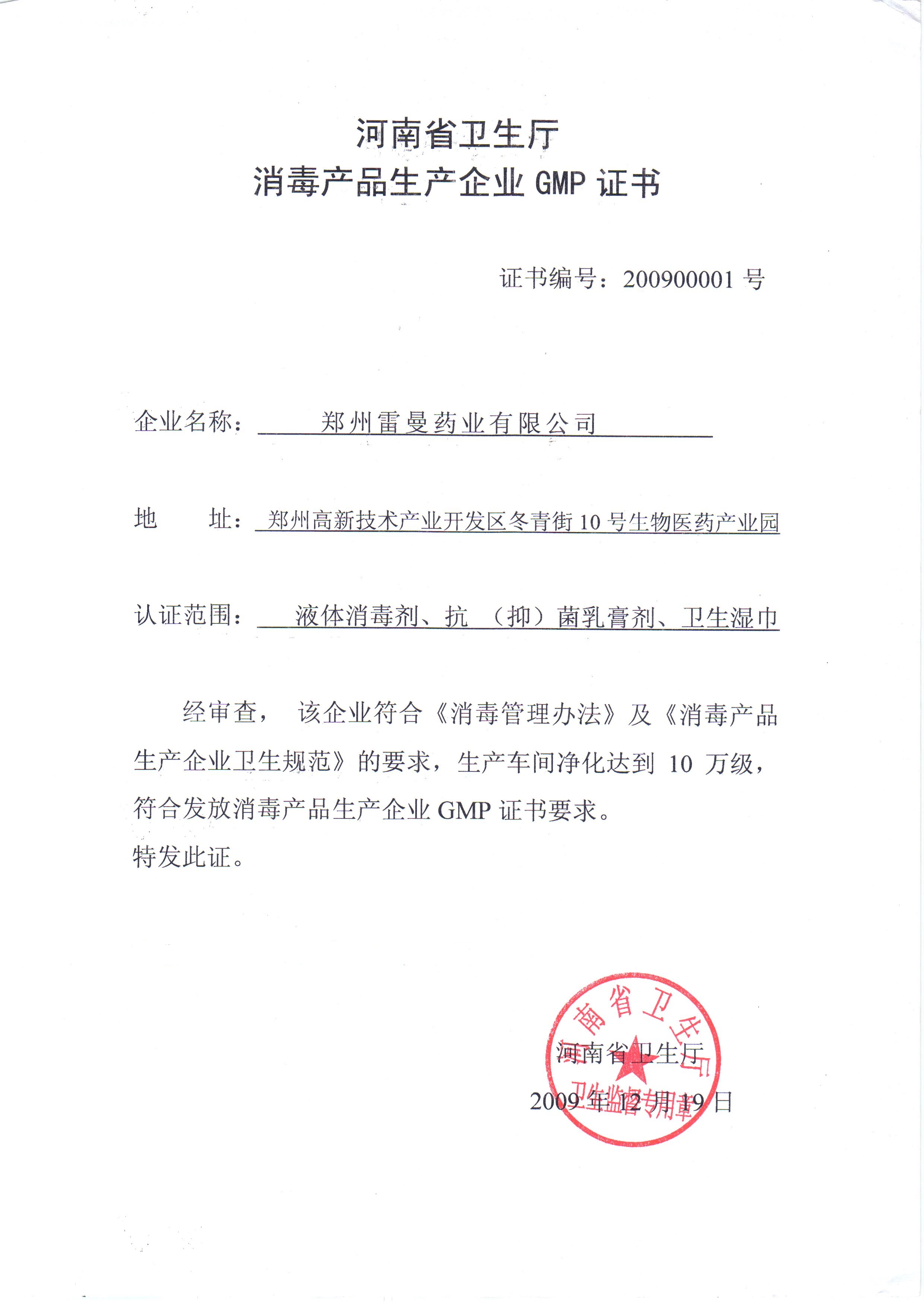 消毒產(chǎn)品生產(chǎn)企業(yè)GMP證書(shū)